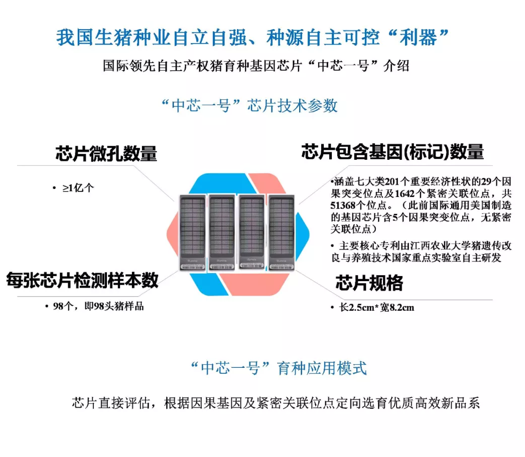 生豬種業(yè)作為產(chǎn)業(yè)鏈“芯片”,是我國種業(yè)主要卡脖子產(chǎn)品?;蛐酒N因其準(zhǔn)確性高而成為國際主流技術(shù)。江西農(nóng)業(yè)大學(xué)研究人員專心致志30多年,研發(fā)了育種性能全面超過美國的家豬新品種培育基因芯片——“中芯一號”,成為國際領(lǐng)先水平的基因育種主導(dǎo)技術(shù)。