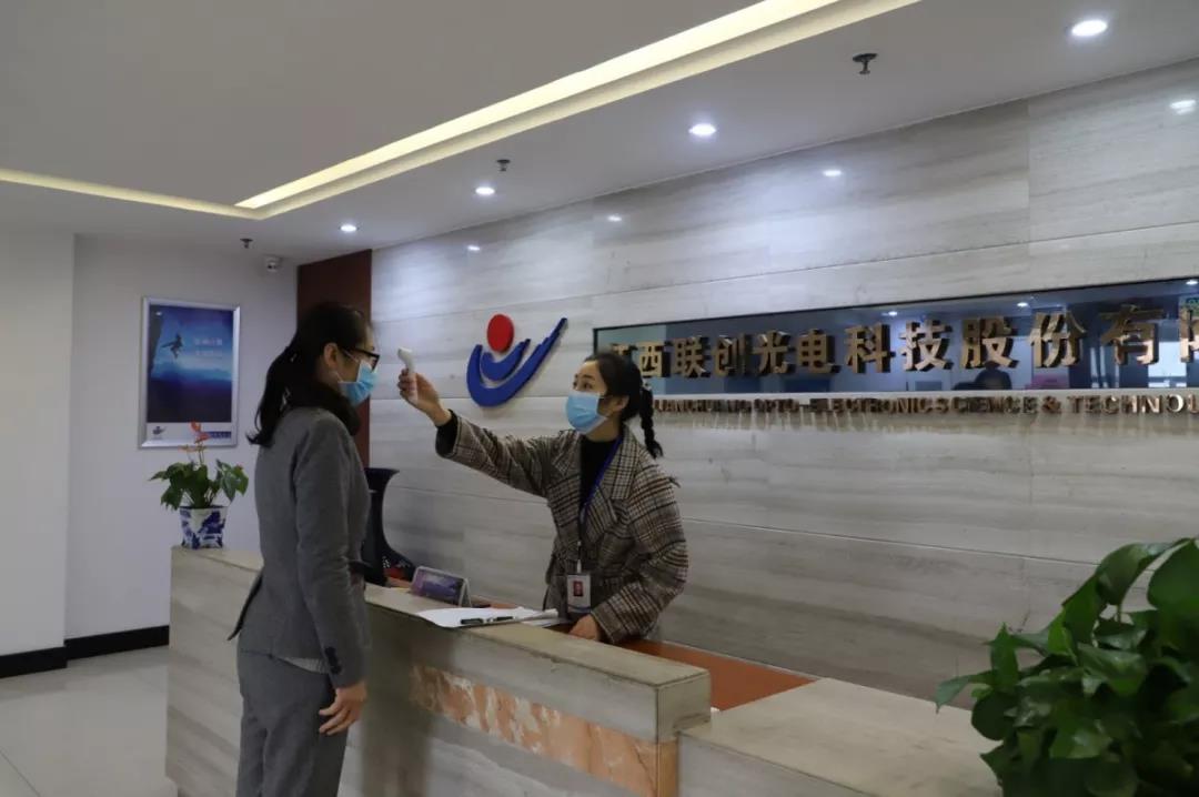 聯(lián)創(chuàng)光電科技園區(qū)實施封閉式管理,人員及車輛需憑核發(fā)的出入證進出園區(qū)。園區(qū)東門崗和南門崗分別設(shè)立體溫檢測點,對所有人員進行實名制身份證查驗、體溫測量和信息登記,堅決杜絕體溫異常人員進入園區(qū)和生產(chǎn)、公共辦公場所。