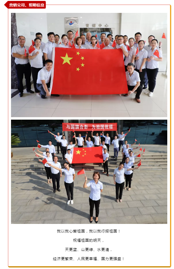 為慶祝中華人民共和國成立70周年,集團下屬各經(jīng)營單位紛紛開展了“與國旗合影 為祖國祝?!敝黝}活動。每一個鏡頭都傳遞一種聲音,每一面國旗都代表一顆中國心。下面,我們曬出每一張與國旗的合影,秀出我們對偉大祖國最真摯的熱愛和祝福!